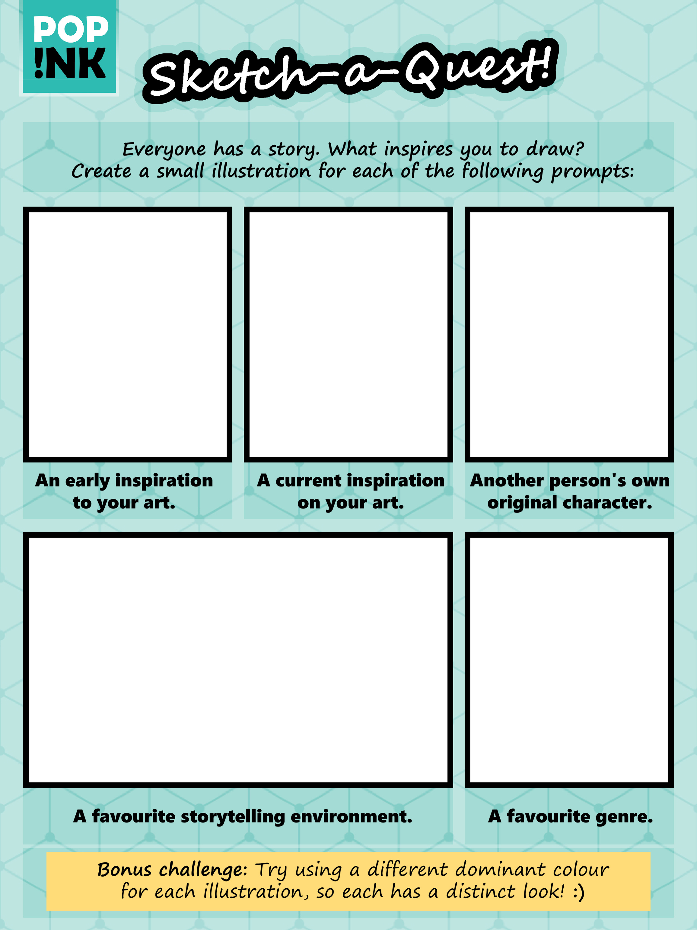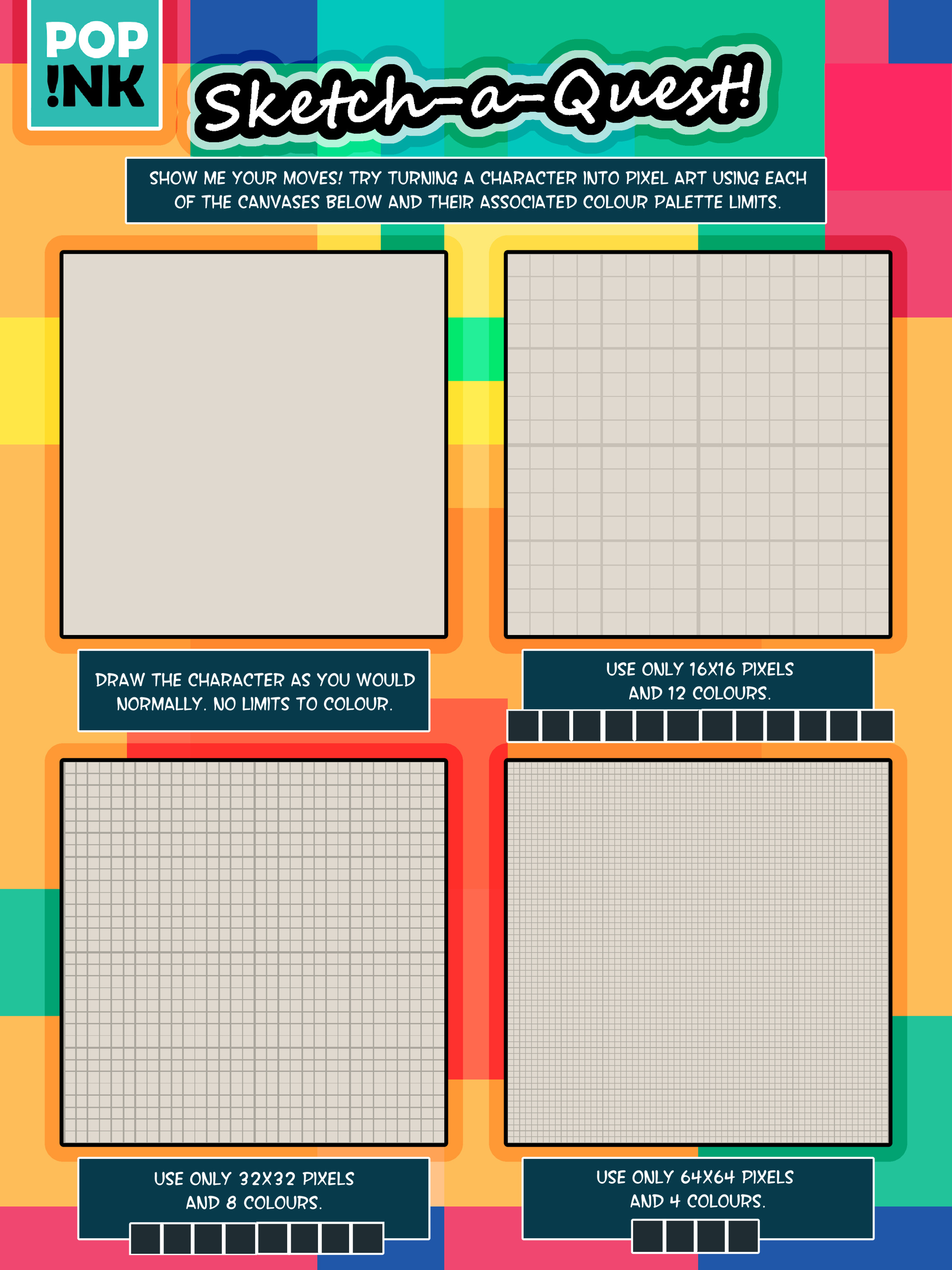 Copy the template above and draw in the empty spaces, following the prompts below each box. Then send your finished image to the POP !NK team through email using these details:Address: [email protected]Subject: Sketch-a-questWith your permission, we will share some of the submissions on our website or on our bluesky social media page.