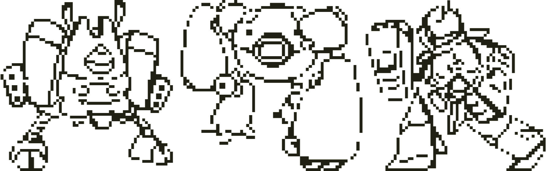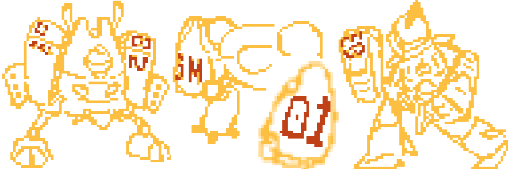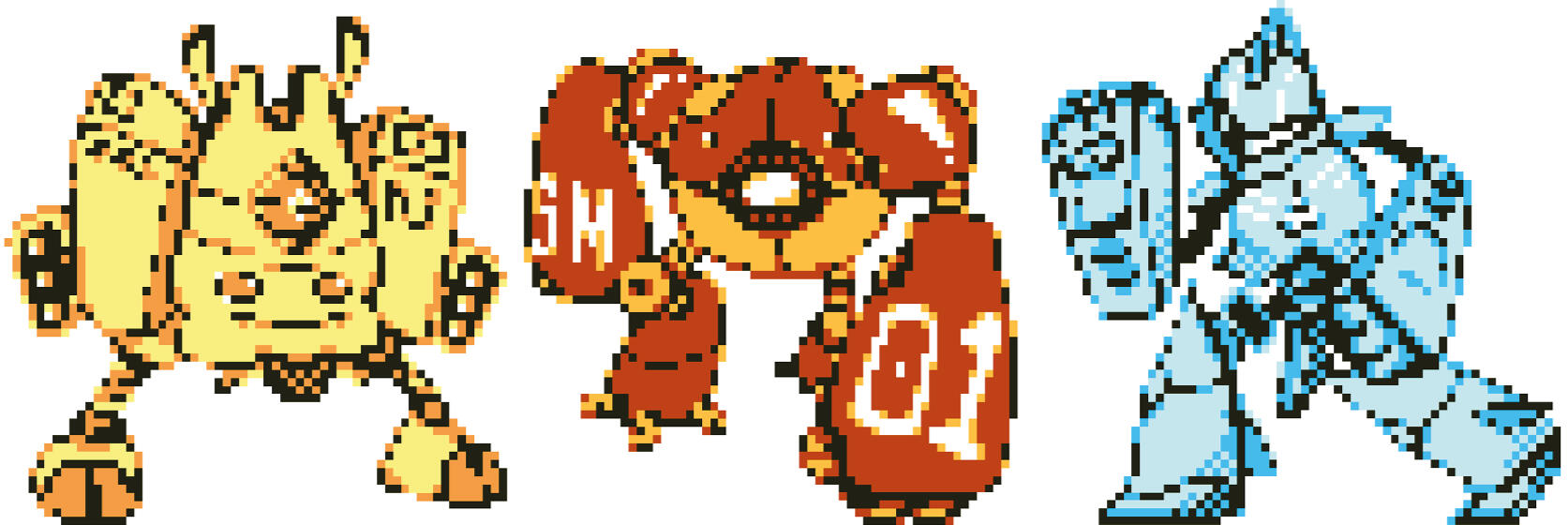 The big difference between the three mechs is the colour of the number markings. This is the due to the primary shade used. Mechs 2 and 3’s primary colour is the lighter shade, so if the numbers were white it may be harder to see and you wouldn’t be able to effectively use a gradient to improve its form. So, sorry ‘Super Mega Mecha Ninja’ fans, but two of the sprites aren’t canonically accurate!